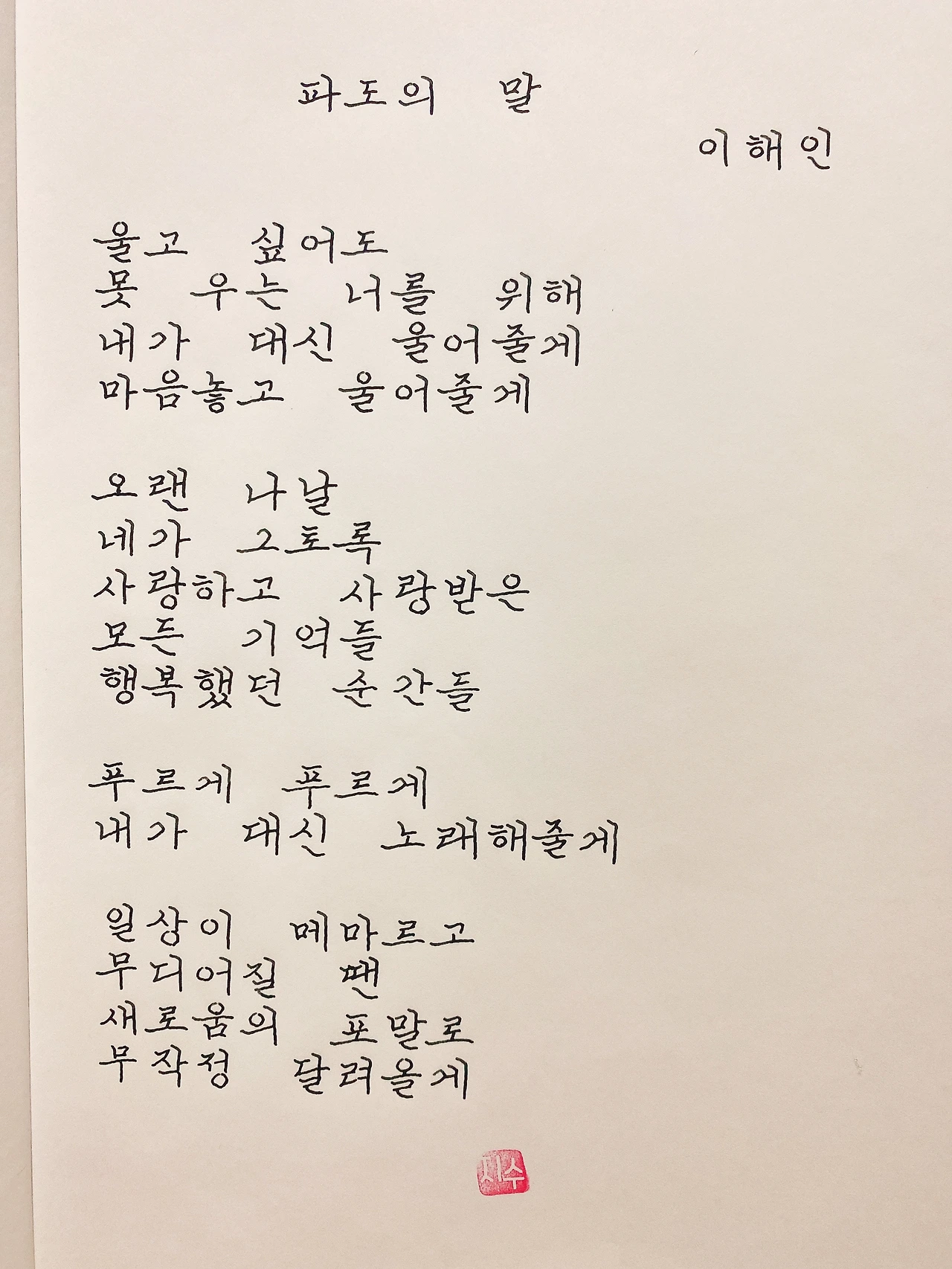 평범한 직장인. 사내 동호회를 통해 매일 한편 손으로 시 읽기를 시작한 이후로, 매일 시 한편을 필사 합니다. 필사한 시가 저작권에 문제가 된다면 말씀해주세요.