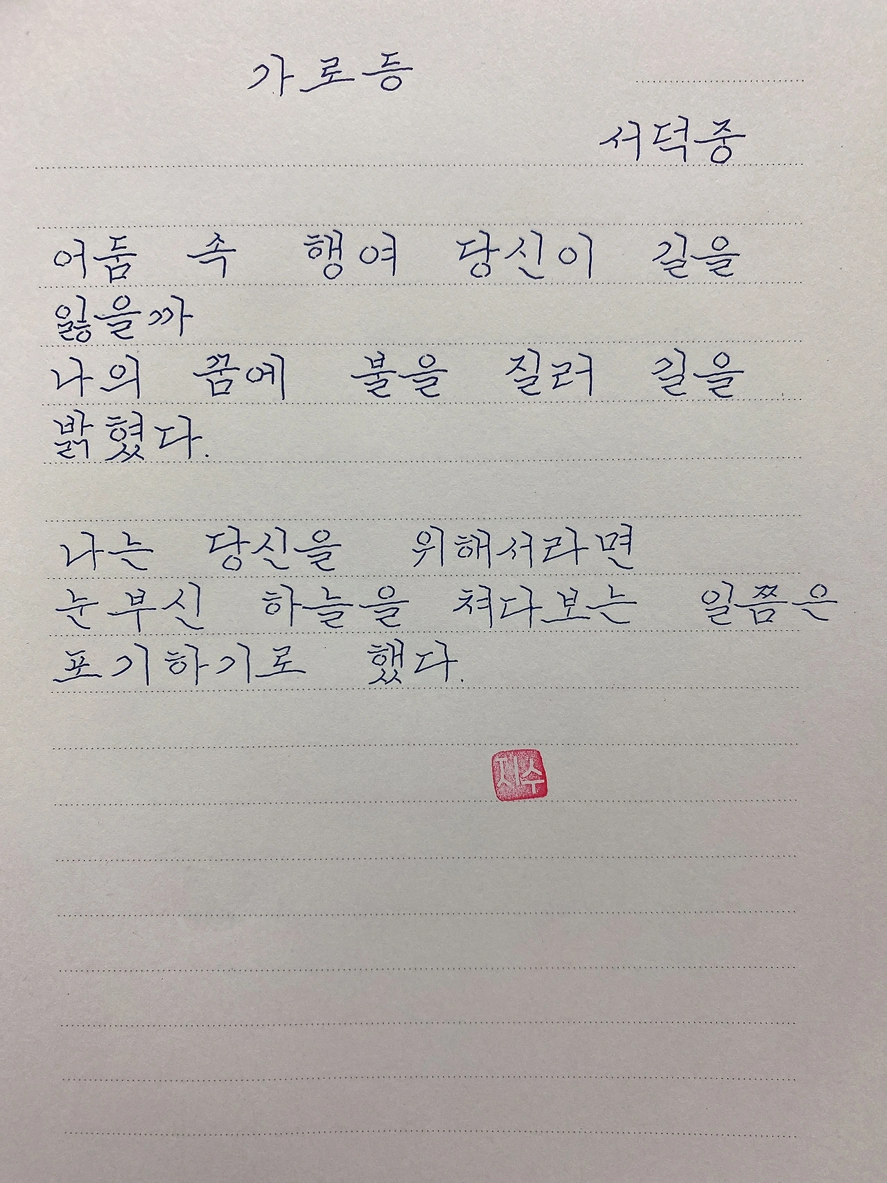 평범한 직장인. 사내 동호회를 통해 매일 한편 손으로 시 읽기를 시작한 이후로, 매일 시 한편을 필사 합니다. 필사한 시가 저작권에 문제가 된다면 말씀해주세요.