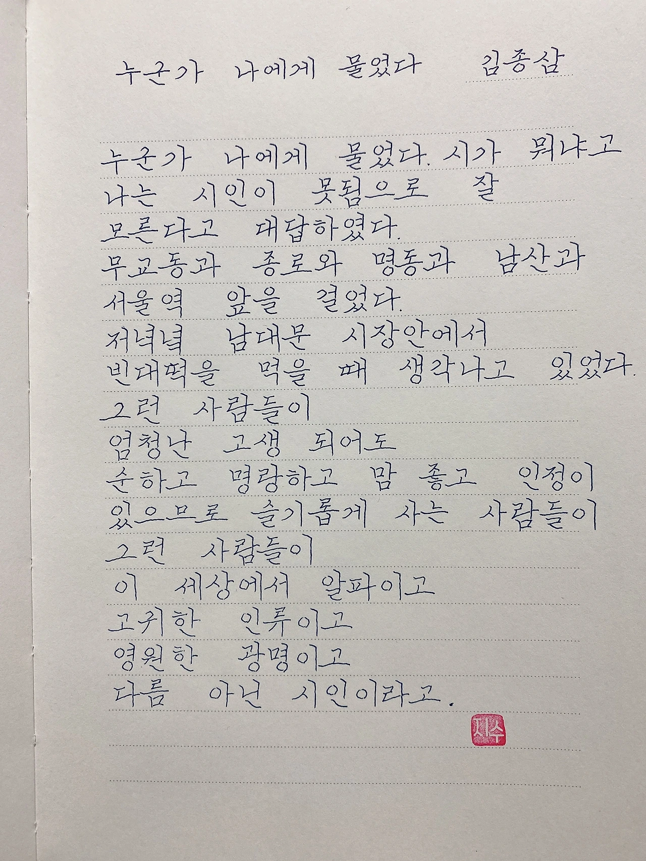 평범한 직장인. 사내 동호회를 통해 매일 한편 손으로 시 읽기를 시작한 이후로, 매일 시 한편을 필사 합니다. 필사한 시가 저작권에 문제가 된다면 말씀해주세요.