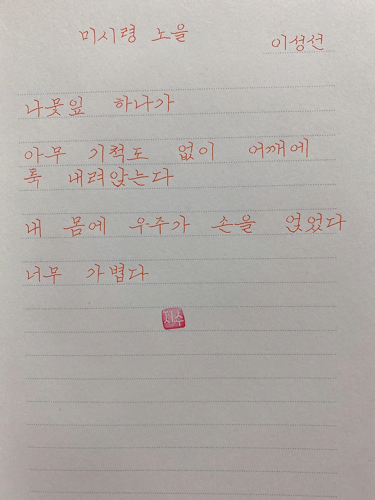 평범한 직장인. 사내 동호회를 통해 매일 한편 손으로 시 읽기를 시작한 이후로, 매일 시 한편을 필사 합니다. 필사한 시가 저작권에 문제가 된다면 말씀해주세요.