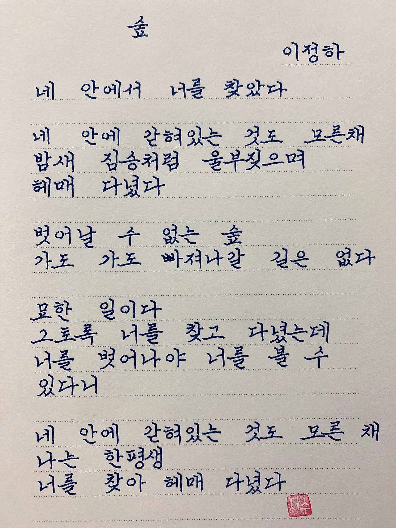 평범한 직장인. 사내 동호회를 통해 매일 한편 손으로 시 읽기를 시작한 이후로, 매일 시 한편을 필사 합니다. 필사한 시가 저작권에 문제가 된다면 말씀해주세요.