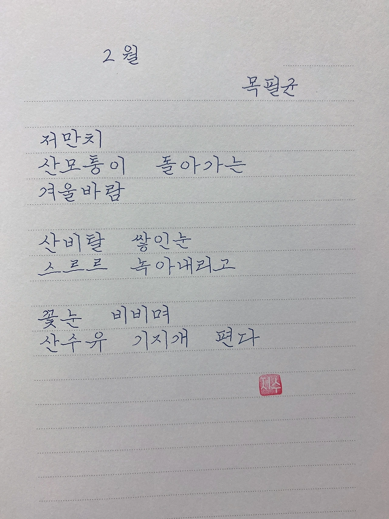 평범한 직장인. 사내 동호회를 통해 매일 한편 손으로 시 읽기를 시작한 이후로, 매일 시 한편을 필사 합니다. 필사한 시가 저작권에 문제가 된다면 말씀해주세요.