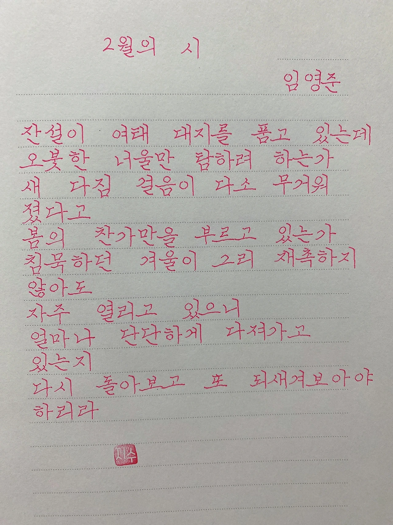 평범한 직장인. 사내 동호회를 통해 매일 한편 손으로 시 읽기를 시작한 이후로, 매일 시 한편을 필사 합니다. 필사한 시가 저작권에 문제가 된다면 말씀해주세요.