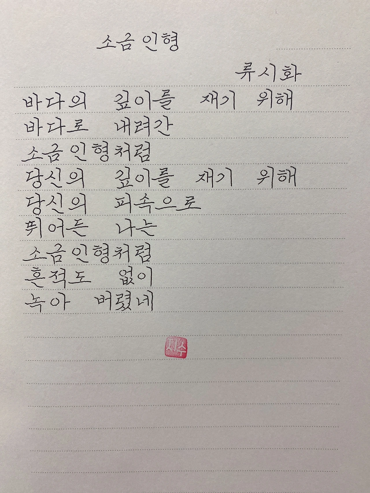 평범한 직장인. 사내 동호회를 통해 매일 한편 손으로 시 읽기를 시작한 이후로, 매일 시 한편을 필사 합니다. 필사한 시가 저작권에 문제가 된다면 말씀해주세요.