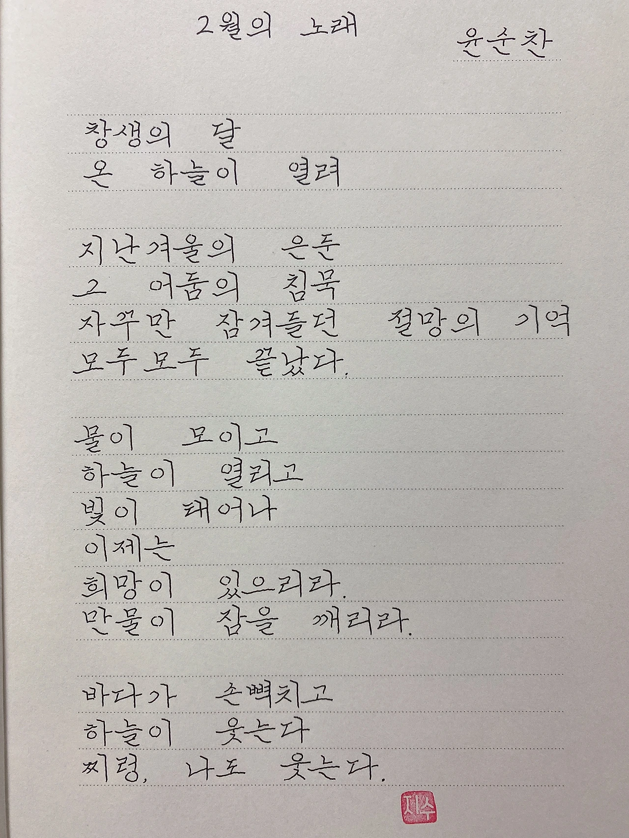 평범한 직장인. 사내 동호회를 통해 매일 한편 손으로 시 읽기를 시작한 이후로, 매일 시 한편을 필사 합니다. 필사한 시가 저작권에 문제가 된다면 말씀해주세요.