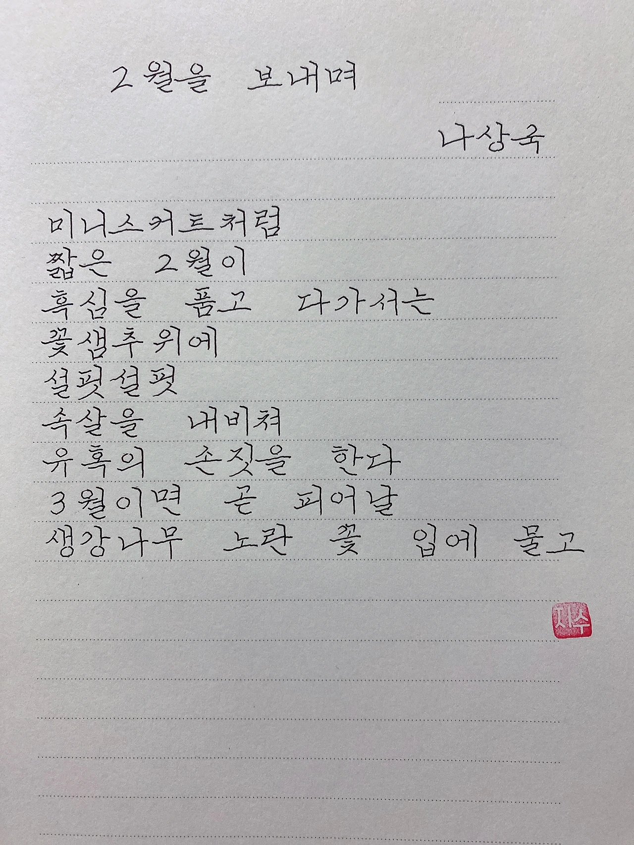 평범한 직장인. 사내 동호회를 통해 매일 한편 손으로 시 읽기를 시작한 이후로, 매일 시 한편을 필사 합니다. 필사한 시가 저작권에 문제가 된다면 말씀해주세요.