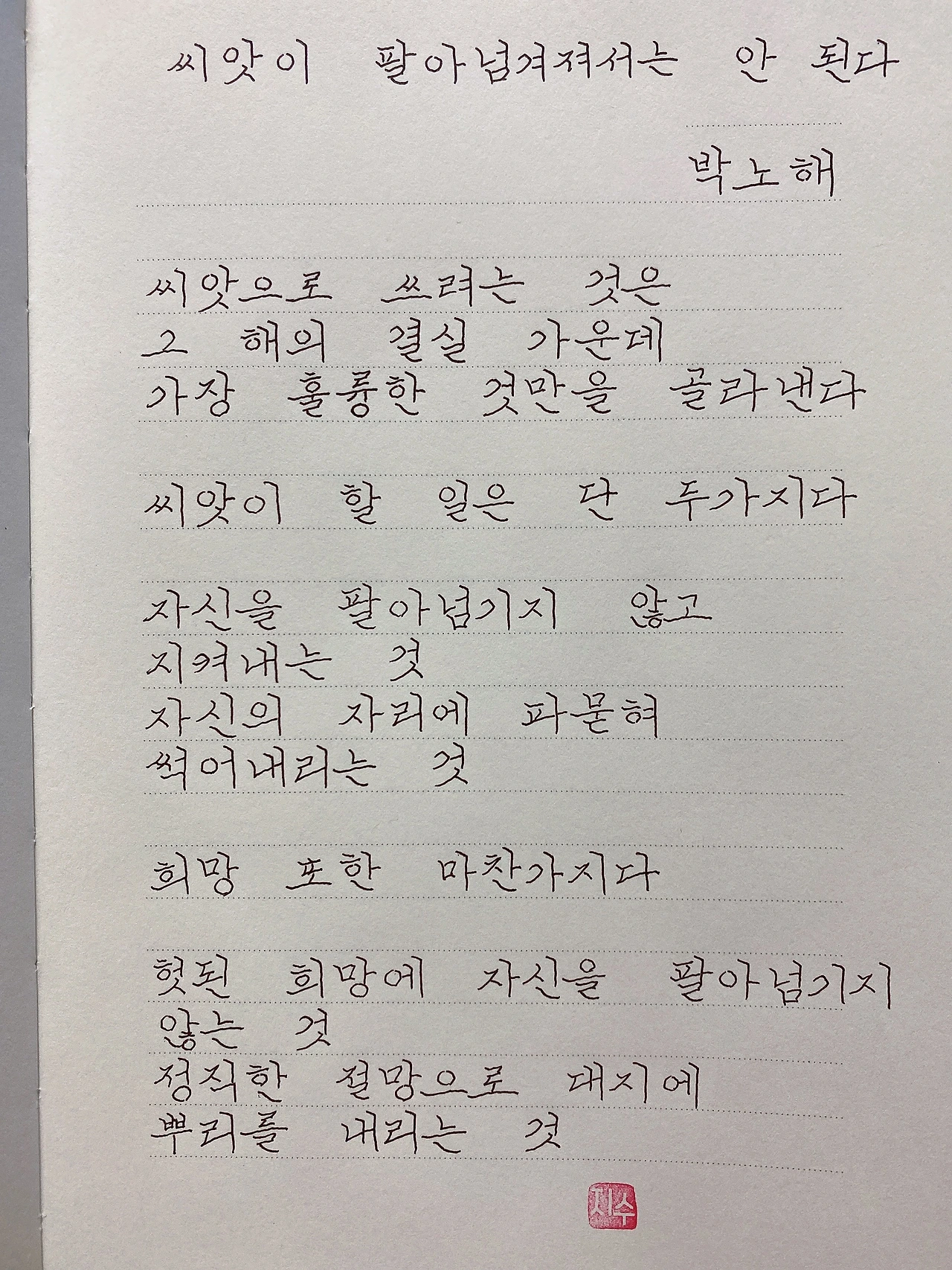 평범한 직장인. 사내 동호회를 통해 매일 한편 손으로 시 읽기를 시작한 이후로, 매일 시 한편을 필사 합니다. 필사한 시가 저작권에 문제가 된다면 말씀해주세요.