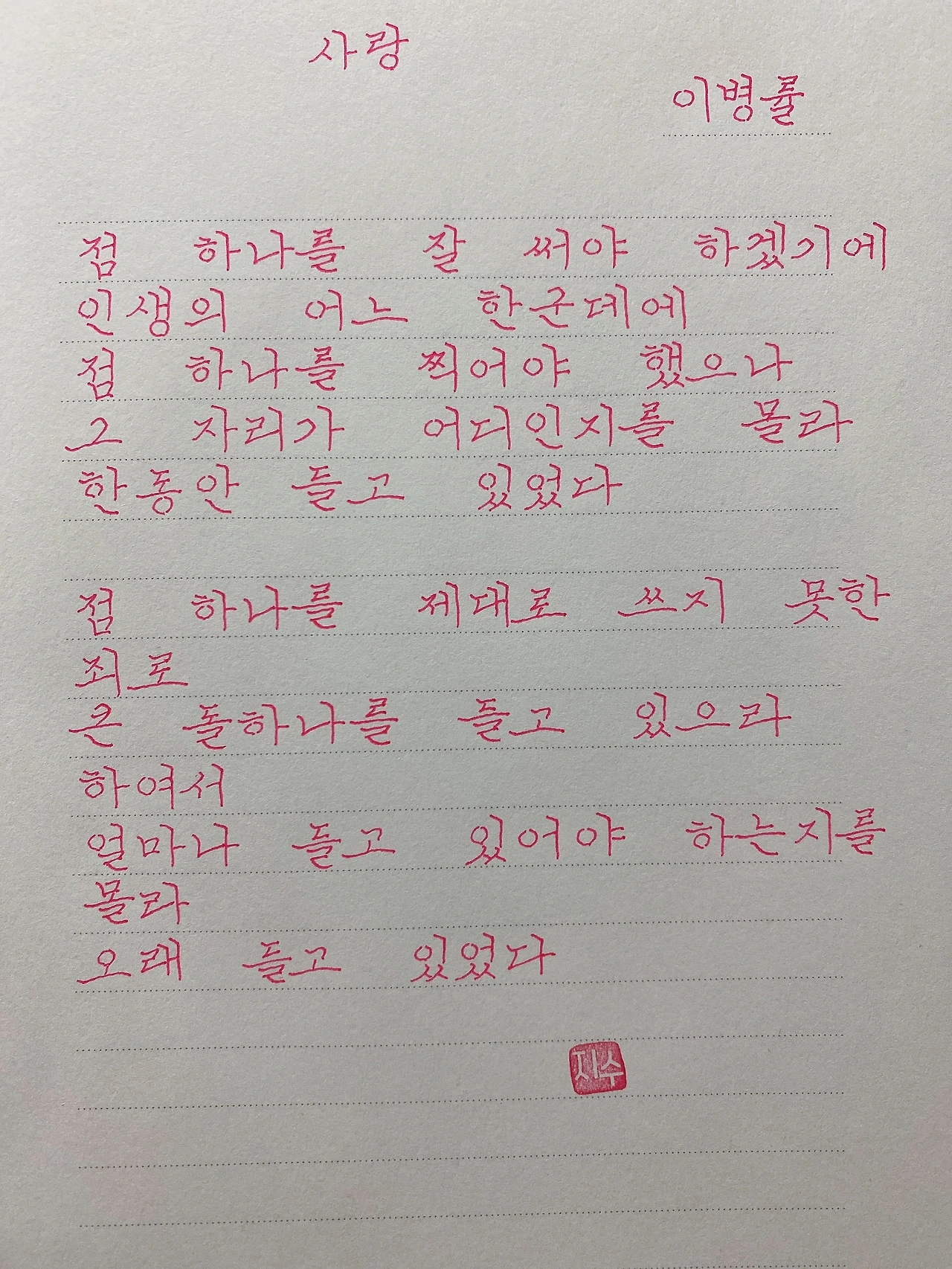 평범한 직장인. 사내 동호회를 통해 매일 한편 손으로 시 읽기를 시작한 이후로, 매일 시 한편을 필사 합니다. 필사한 시가 저작권에 문제가 된다면 말씀해주세요.