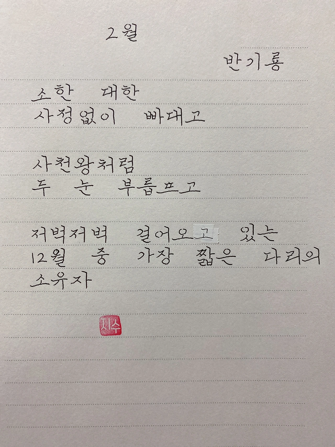 평범한 직장인. 사내 동호회를 통해 매일 한편 손으로 시 읽기를 시작한 이후로, 매일 시 한편을 필사 합니다. 필사한 시가 저작권에 문제가 된다면 말씀해주세요.