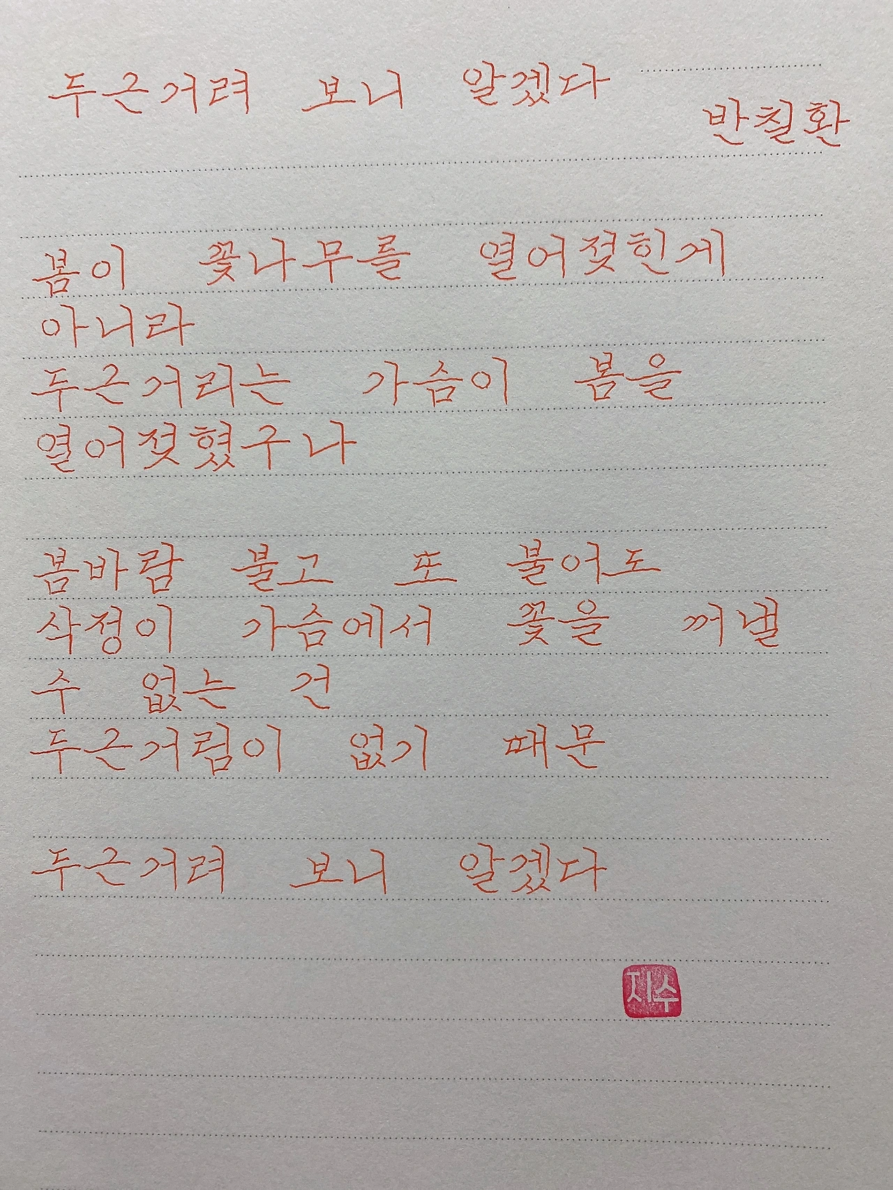평범한 직장인. 사내 동호회를 통해 매일 한편 손으로 시 읽기를 시작한 이후로, 매일 시 한편을 필사 합니다. 필사한 시가 저작권에 문제가 된다면 말씀해주세요.