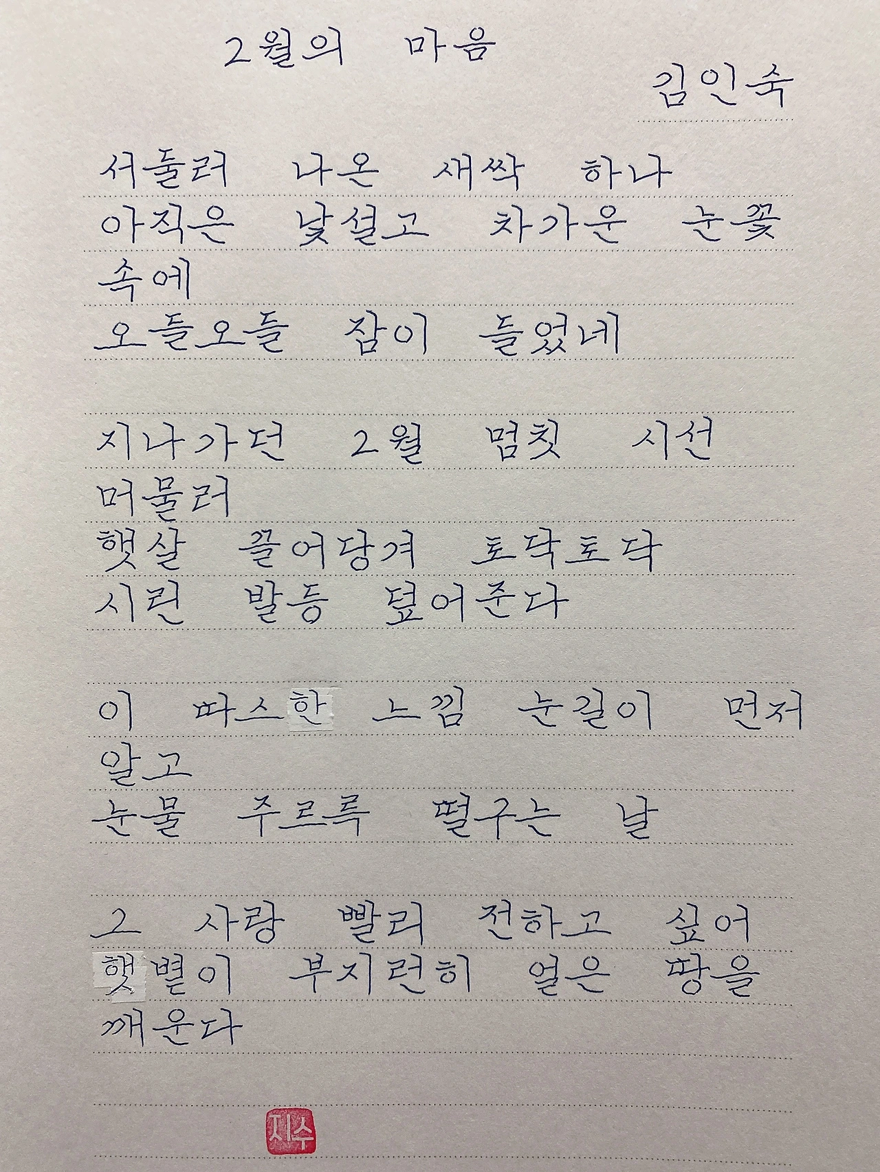 평범한 직장인. 사내 동호회를 통해 매일 한편 손으로 시 읽기를 시작한 이후로, 매일 시 한편을 필사 합니다. 필사한 시가 저작권에 문제가 된다면 말씀해주세요.