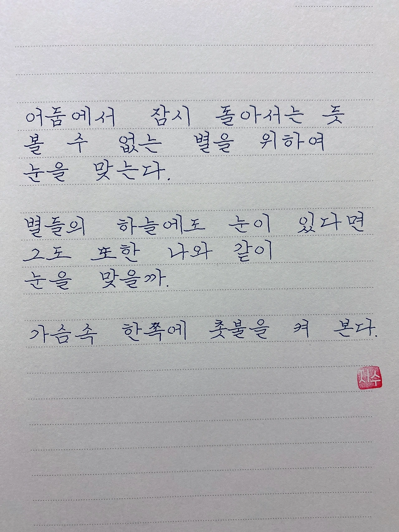 평범한 직장인. 사내 동호회를 통해 매일 한편 손으로 시 읽기를 시작한 이후로, 매일 시 한편을 필사 합니다. 필사한 시가 저작권에 문제가 된다면 말씀해주세요.