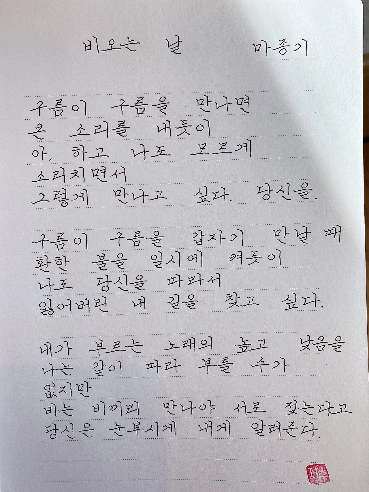 평범한 직장인. 사내 동호회를 통해 매일 한편 손으로 시 읽기를 시작한 이후로, 매일 시 한편을 필사 합니다. 필사한 시가 저작권에 문제가 된다면 말씀해주세요.