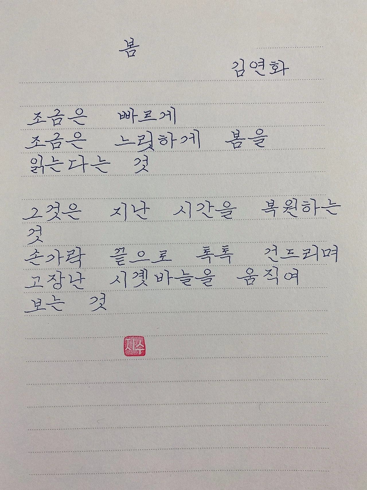 평범한 직장인. 사내 동호회를 통해 매일 한편 손으로 시 읽기를 시작한 이후로, 매일 시 한편을 필사 합니다. 필사한 시가 저작권에 문제가 된다면 말씀해주세요.