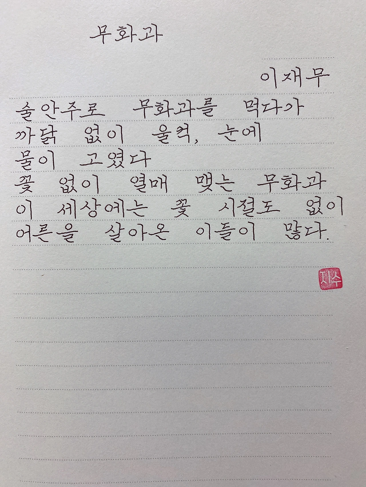 평범한 직장인. 사내 동호회를 통해 매일 한편 손으로 시 읽기를 시작한 이후로, 매일 시 한편을 필사 합니다. 필사한 시가 저작권에 문제가 된다면 말씀해주세요.