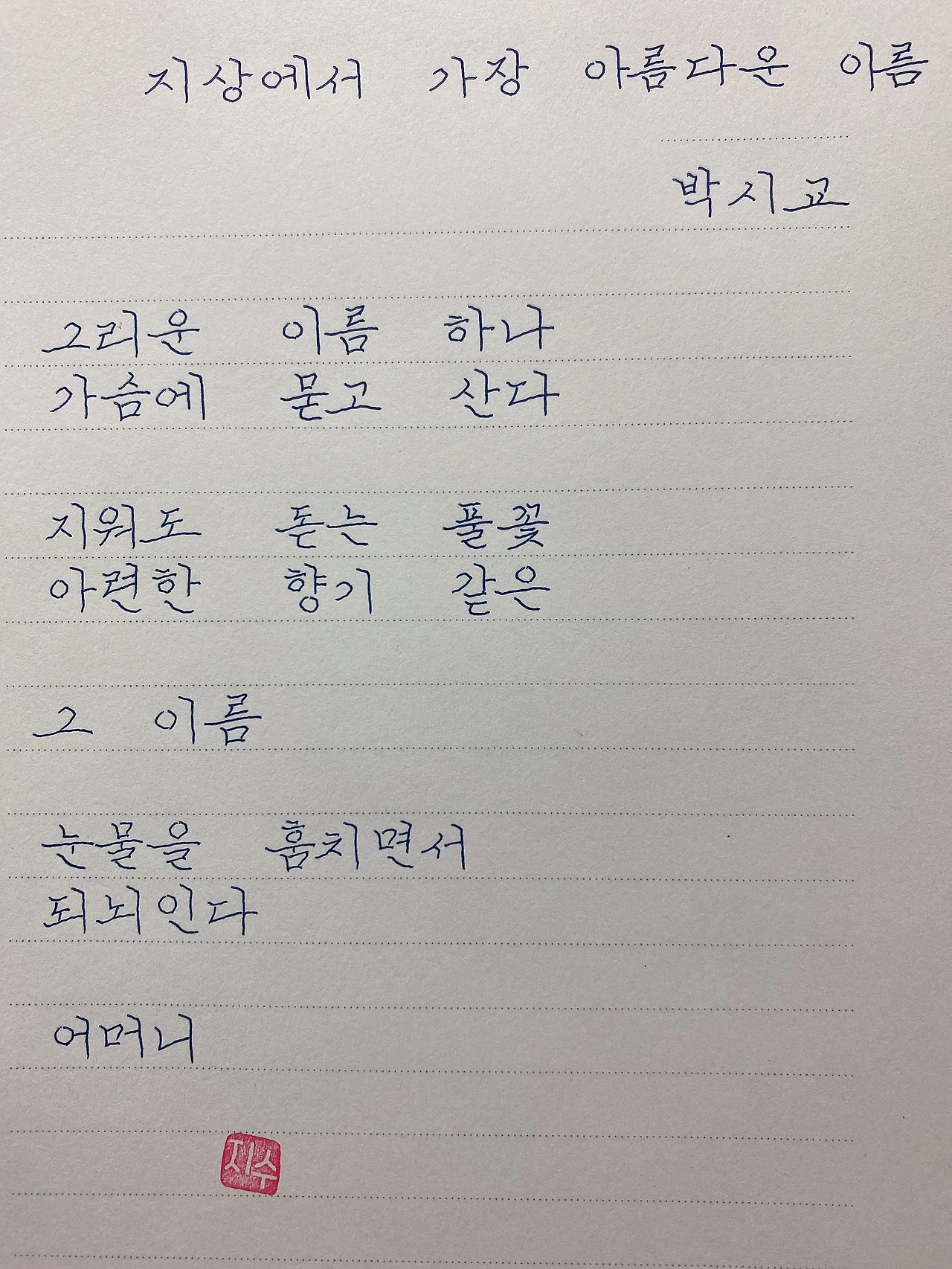 평범한 직장인. 사내 동호회를 통해 매일 한편 손으로 시 읽기를 시작한 이후로, 매일 시 한편을 필사 합니다. 필사한 시가 저작권에 문제가 된다면 말씀해주세요.