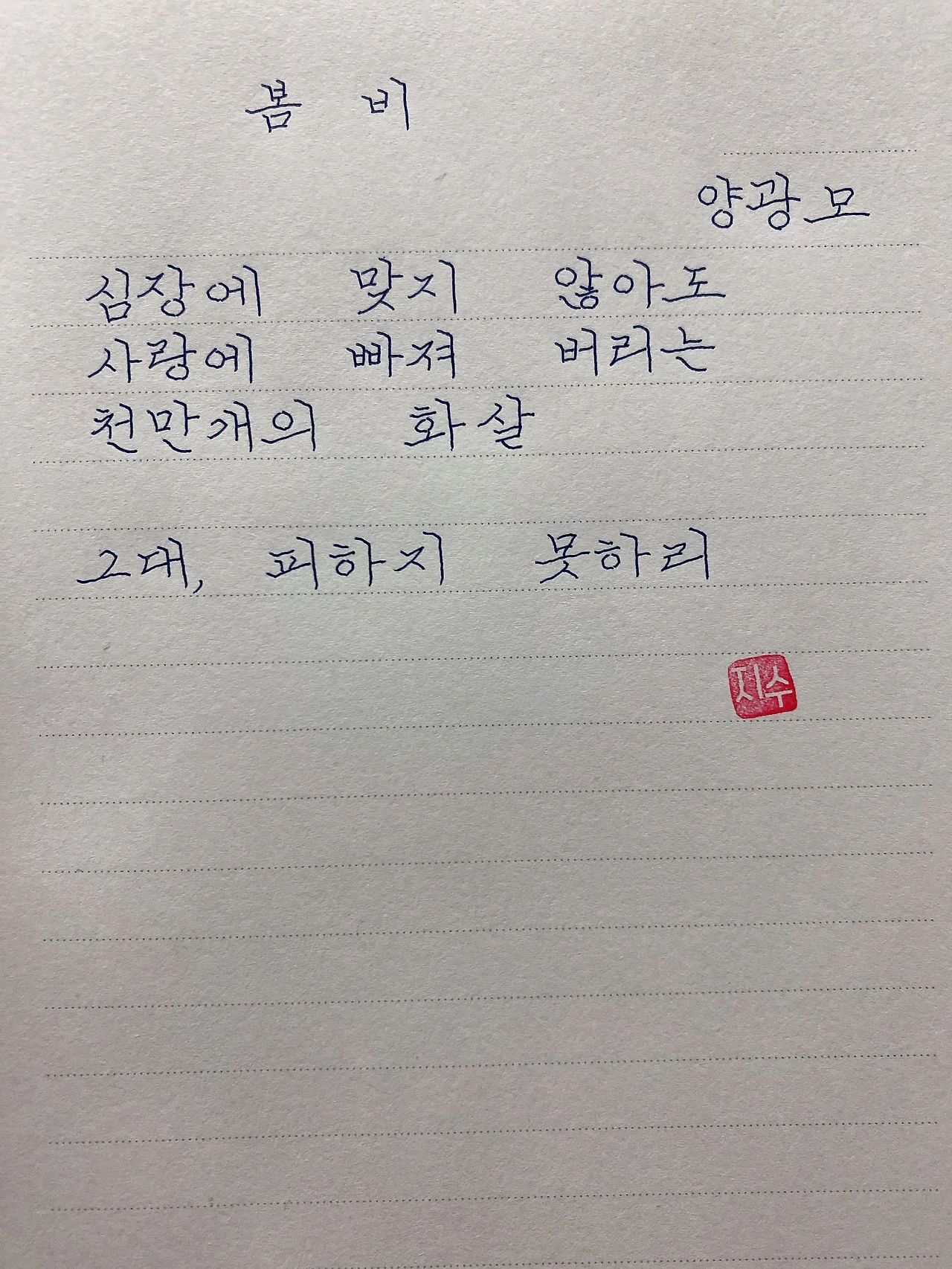 평범한 직장인. 사내 동호회를 통해 매일 한편 손으로 시 읽기를 시작한 이후로, 매일 시 한편을 필사 합니다. 필사한 시가 저작권에 문제가 된다면 말씀해주세요.