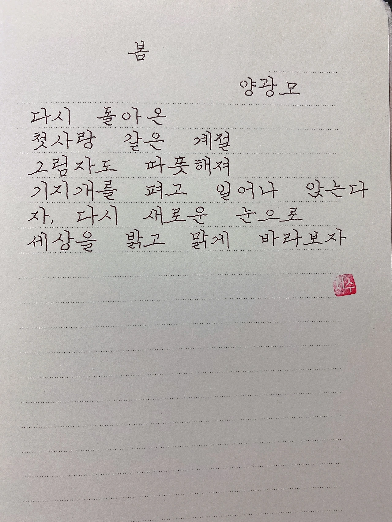 평범한 직장인. 사내 동호회를 통해 매일 한편 손으로 시 읽기를 시작한 이후로, 매일 시 한편을 필사 합니다. 필사한 시가 저작권에 문제가 된다면 말씀해주세요.