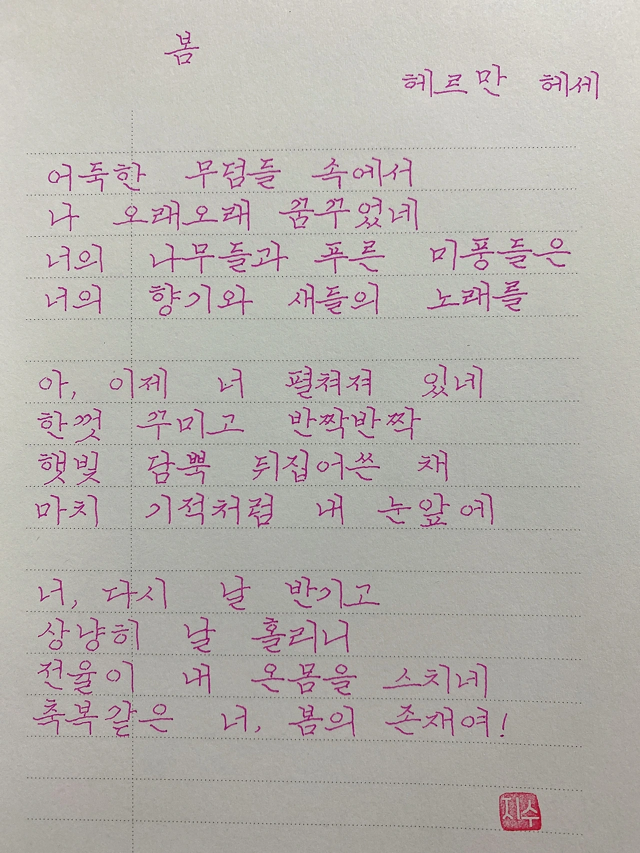 평범한 직장인. 사내 동호회를 통해 매일 한편 손으로 시 읽기를 시작한 이후로, 매일 시 한편을 필사 합니다. 필사한 시가 저작권에 문제가 된다면 말씀해주세요.