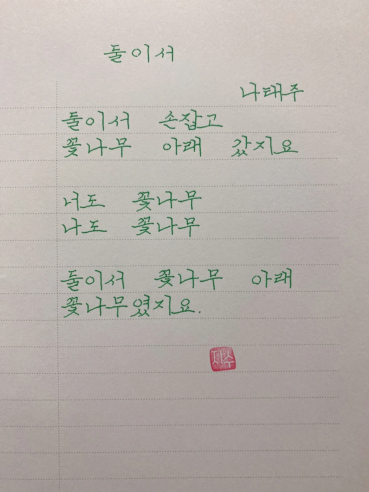 평범한 직장인. 사내 동호회를 통해 매일 한편 손으로 시 읽기를 시작한 이후로, 매일 시 한편을 필사 합니다. 필사한 시가 저작권에 문제가 된다면 말씀해주세요.