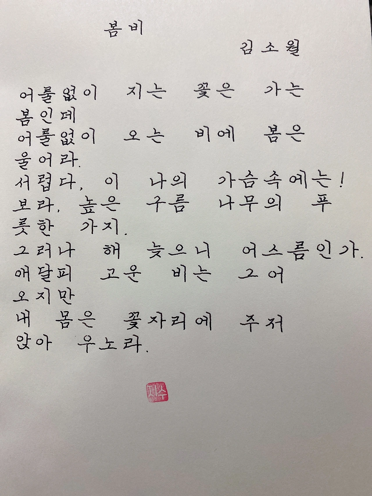 평범한 직장인. 사내 동호회를 통해 매일 한편 손으로 시 읽기를 시작한 이후로, 매일 시 한편을 필사 합니다. 필사한 시가 저작권에 문제가 된다면 말씀해주세요.