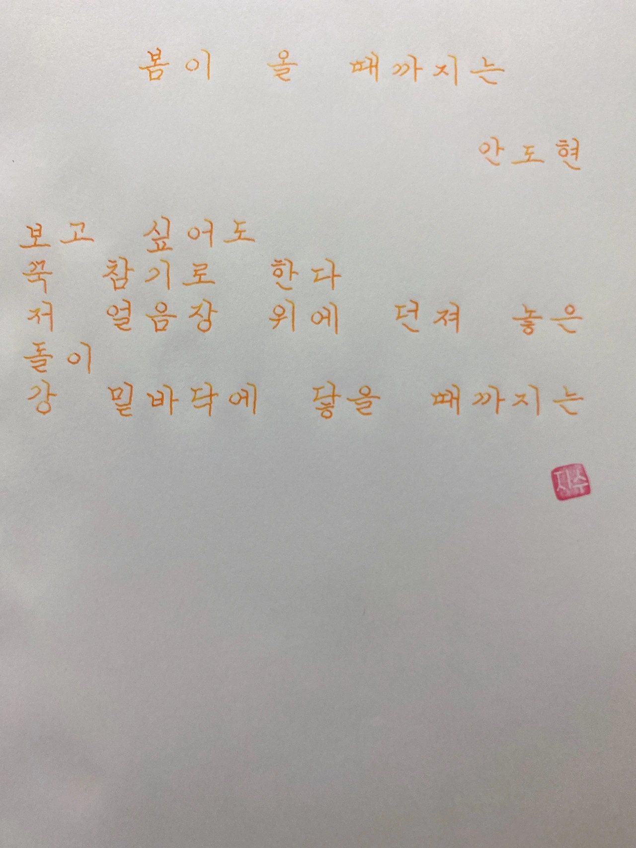평범한 직장인. 사내 동호회를 통해 매일 한편 손으로 시 읽기를 시작한 이후로, 매일 시 한편을 필사 합니다. 필사한 시가 저작권에 문제가 된다면 말씀해주세요.