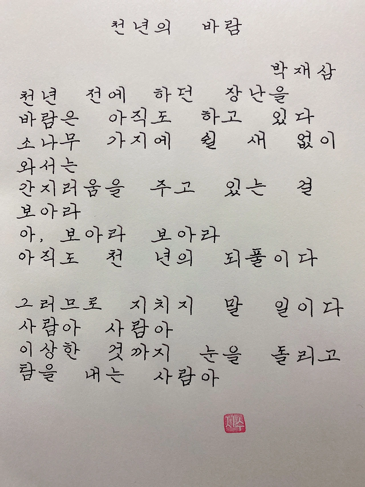평범한 직장인. 사내 동호회를 통해 매일 한편 손으로 시 읽기를 시작한 이후로, 매일 시 한편을 필사 합니다. 필사한 시가 저작권에 문제가 된다면 말씀해주세요.