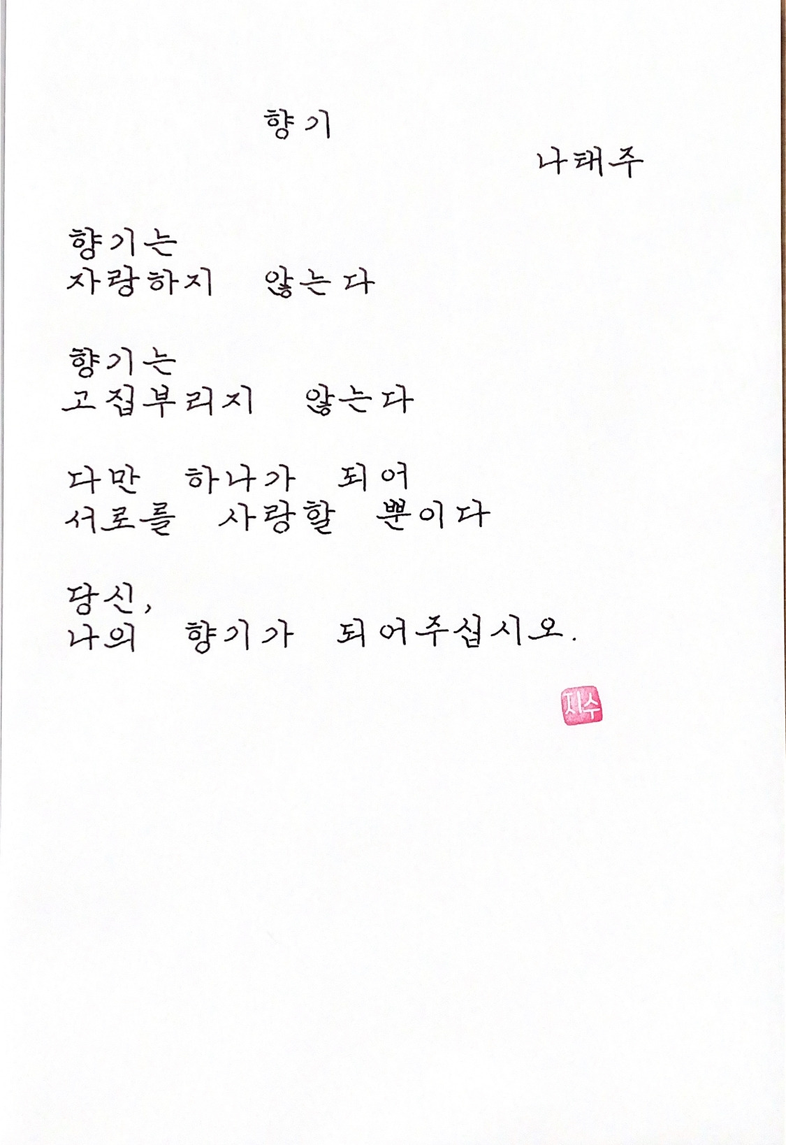 평범한 직장인. 사내 동호회를 통해 매일 한편 손으로 시 읽기를 시작한 이후로, 매일 시 한편을 필사 합니다. 필사한 시가 저작권에 문제가 된다면 말씀해주세요.