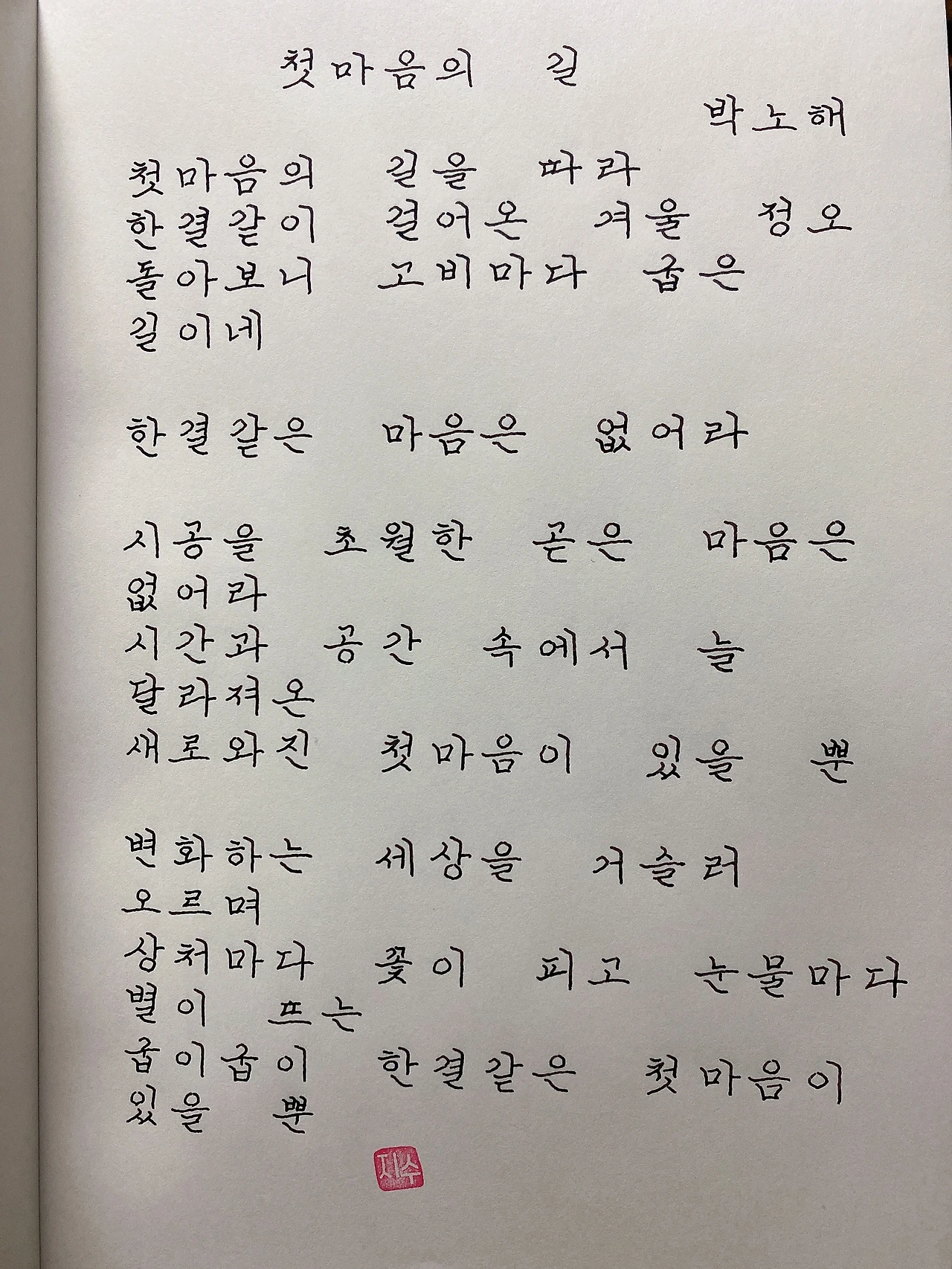평범한 직장인. 사내 동호회를 통해 매일 한편 손으로 시 읽기를 시작한 이후로, 매일 시 한편을 필사 합니다. 필사한 시가 저작권에 문제가 된다면 말씀해주세요.