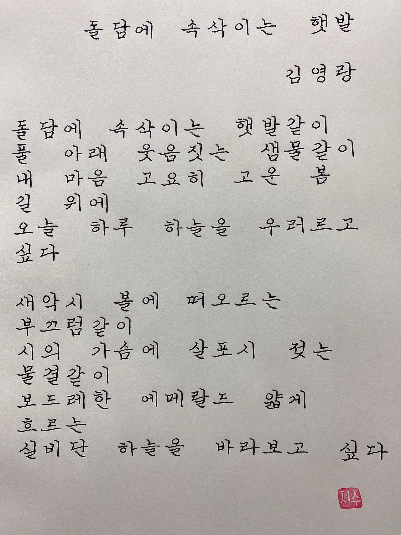 평범한 직장인. 사내 동호회를 통해 매일 한편 손으로 시 읽기를 시작한 이후로, 매일 시 한편을 필사 합니다. 필사한 시가 저작권에 문제가 된다면 말씀해주세요.