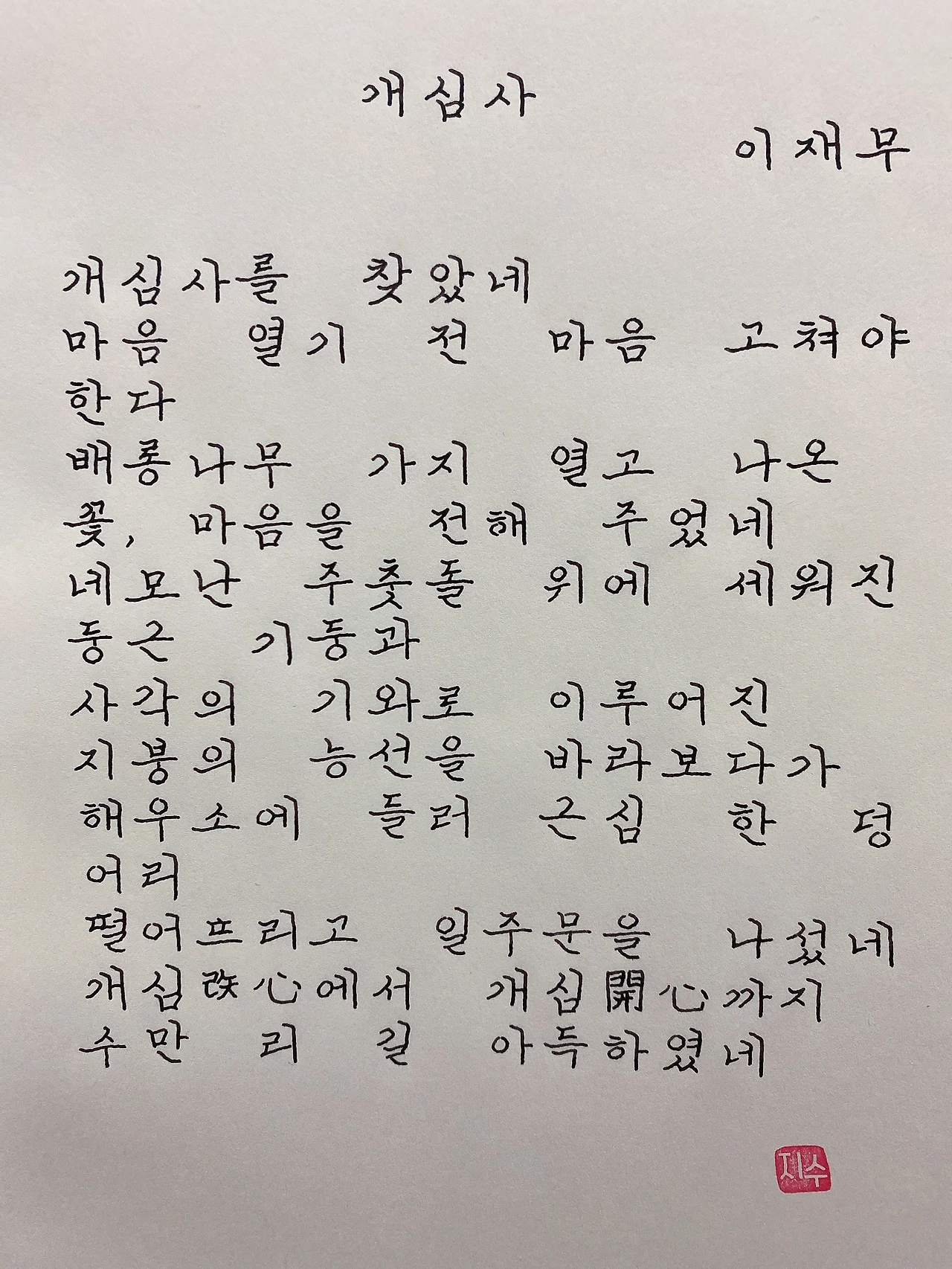 평범한 직장인. 사내 동호회를 통해 매일 한편 손으로 시 읽기를 시작한 이후로, 매일 시 한편을 필사 합니다. 필사한 시가 저작권에 문제가 된다면 말씀해주세요.