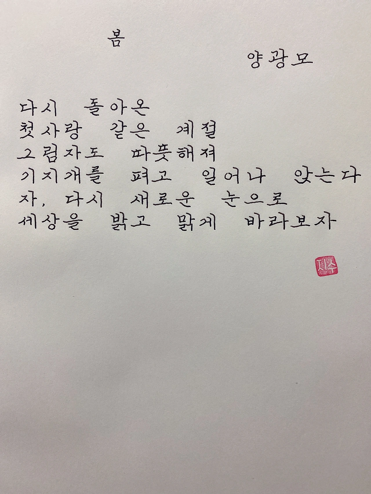 평범한 직장인. 사내 동호회를 통해 매일 한편 손으로 시 읽기를 시작한 이후로, 매일 시 한편을 필사 합니다. 필사한 시가 저작권에 문제가 된다면 말씀해주세요.