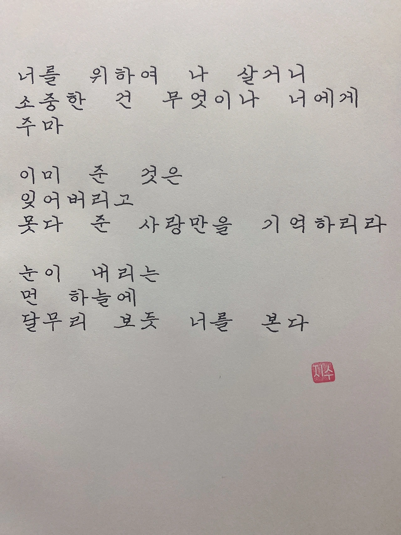 평범한 직장인. 사내 동호회를 통해 매일 한편 손으로 시 읽기를 시작한 이후로, 매일 시 한편을 필사 합니다. 필사한 시가 저작권에 문제가 된다면 말씀해주세요.
