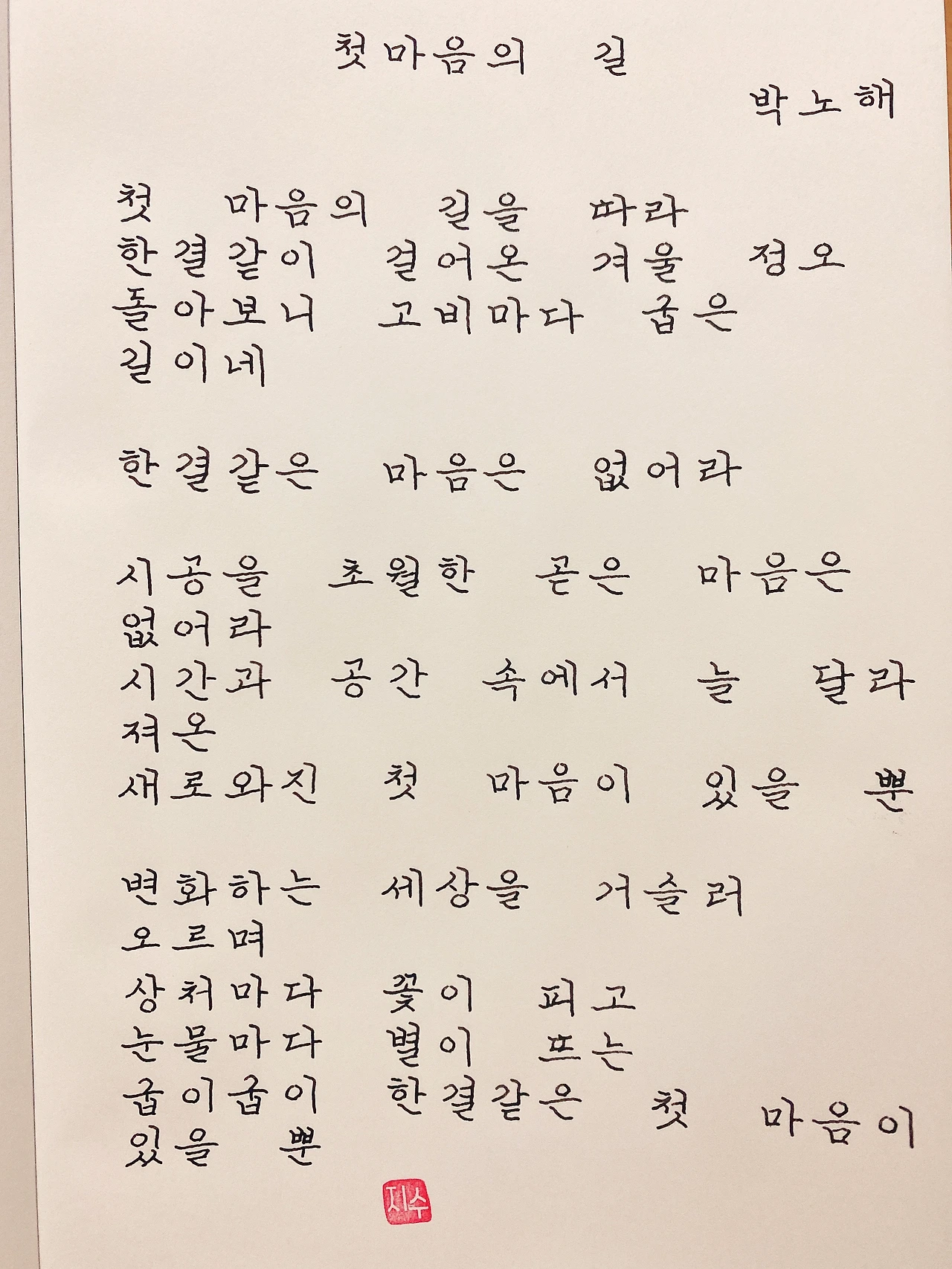 평범한 직장인. 사내 동호회를 통해 매일 한편 손으로 시 읽기를 시작한 이후로, 매일 시 한편을 필사 합니다. 필사한 시가 저작권에 문제가 된다면 말씀해주세요.