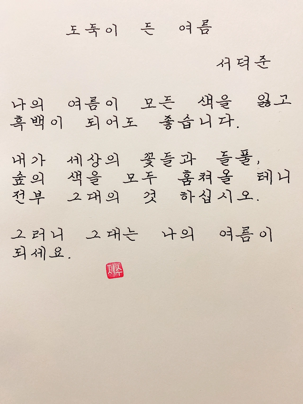 평범한 직장인. 사내 동호회를 통해 매일 한편 손으로 시 읽기를 시작한 이후로, 매일 시 한편을 필사 합니다. 필사한 시가 저작권에 문제가 된다면 말씀해주세요.