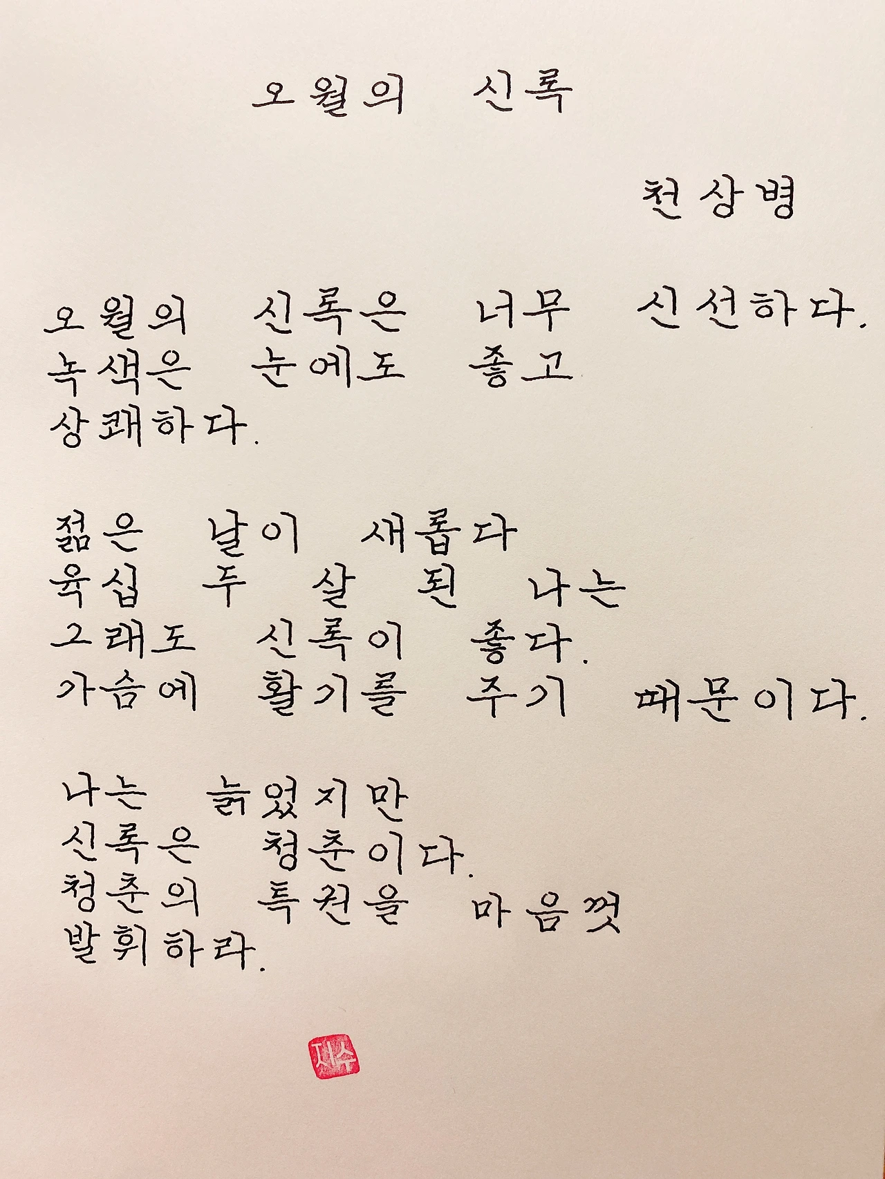 평범한 직장인. 사내 동호회를 통해 매일 한편 손으로 시 읽기를 시작한 이후로, 매일 시 한편을 필사 합니다. 필사한 시가 저작권에 문제가 된다면 말씀해주세요.