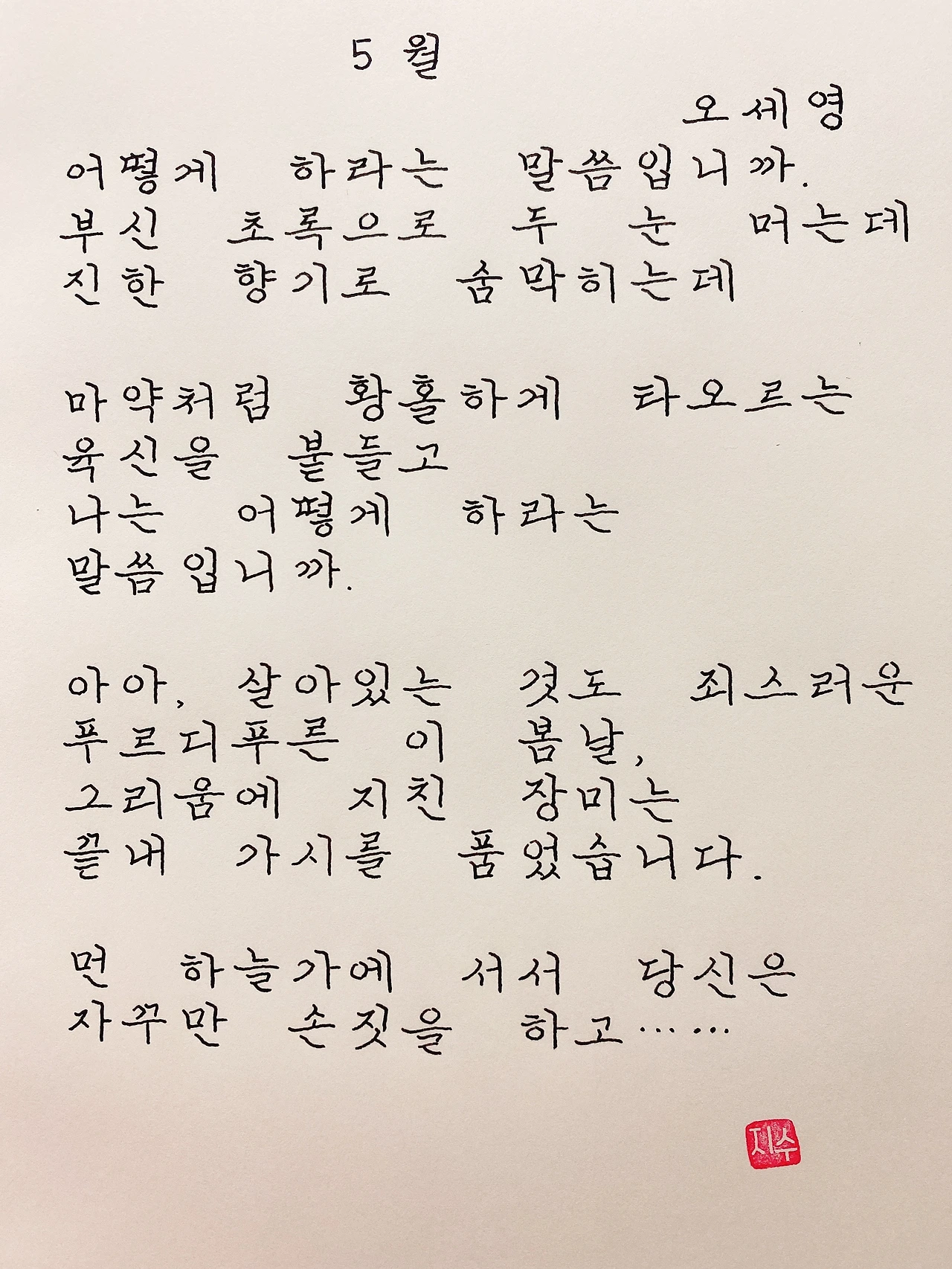 평범한 직장인. 사내 동호회를 통해 매일 한편 손으로 시 읽기를 시작한 이후로, 매일 시 한편을 필사 합니다. 필사한 시가 저작권에 문제가 된다면 말씀해주세요.