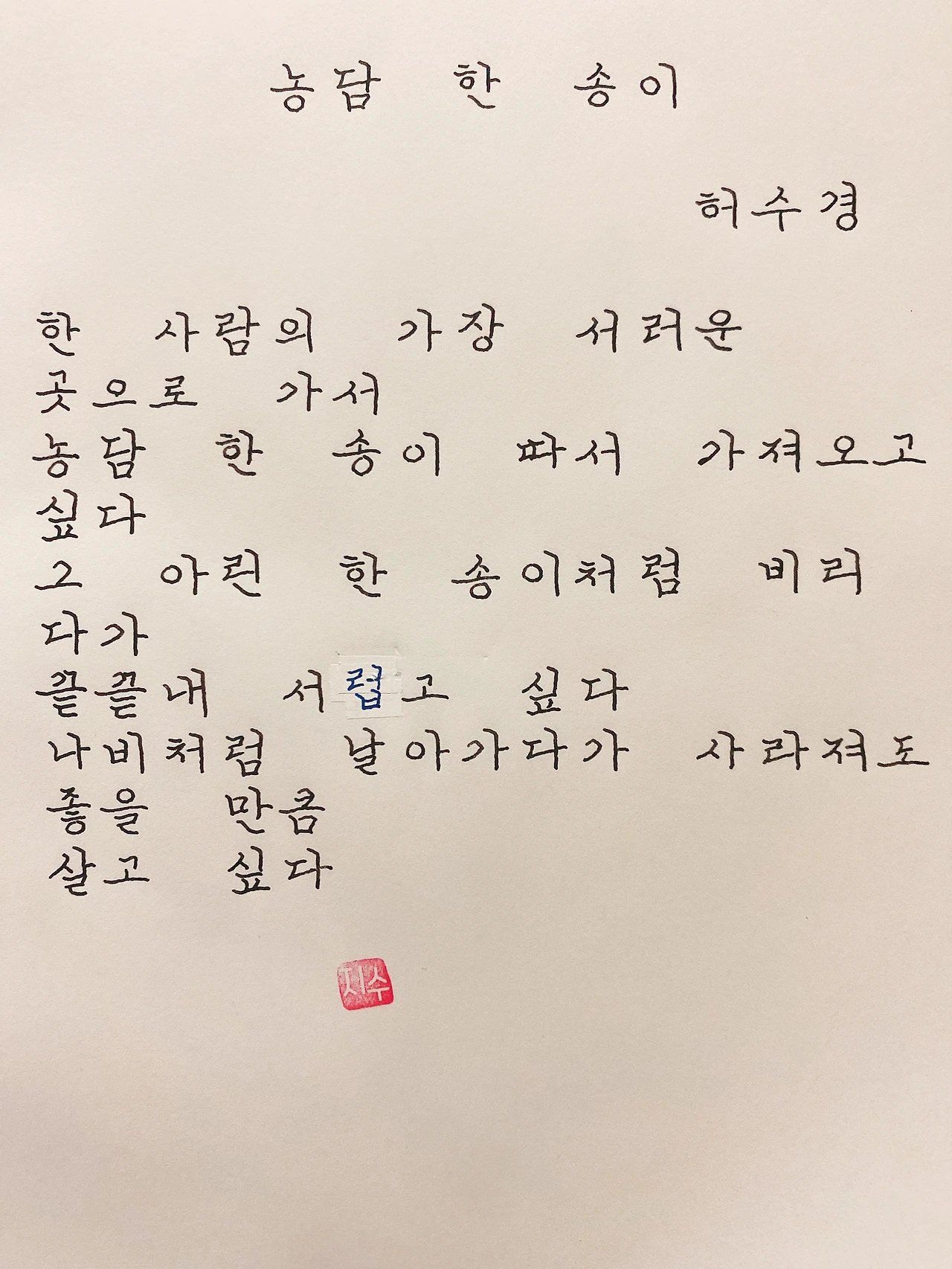 평범한 직장인. 사내 동호회를 통해 매일 한편 손으로 시 읽기를 시작한 이후로, 매일 시 한편을 필사 합니다. 필사한 시가 저작권에 문제가 된다면 말씀해주세요.