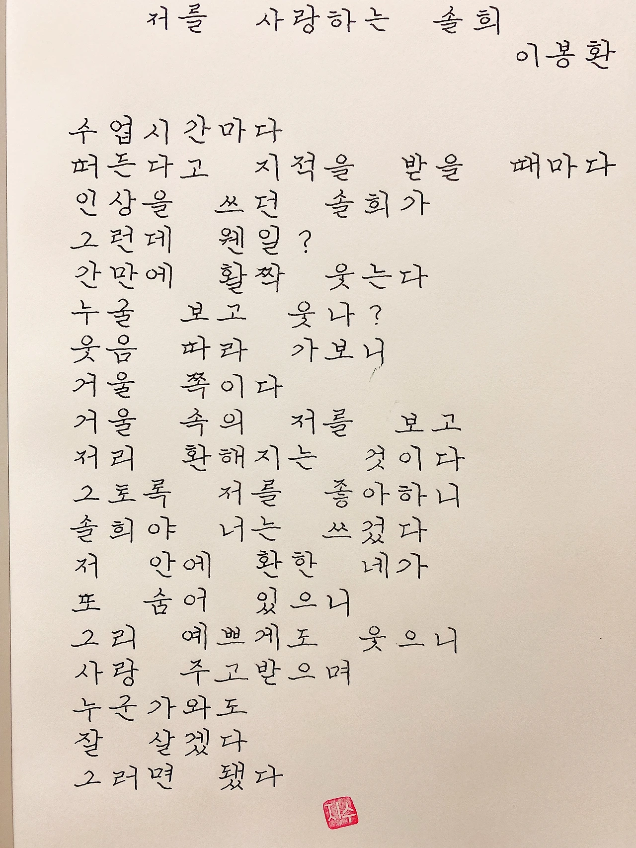 평범한 직장인. 사내 동호회를 통해 매일 한편 손으로 시 읽기를 시작한 이후로, 매일 시 한편을 필사 합니다. 필사한 시가 저작권에 문제가 된다면 말씀해주세요.