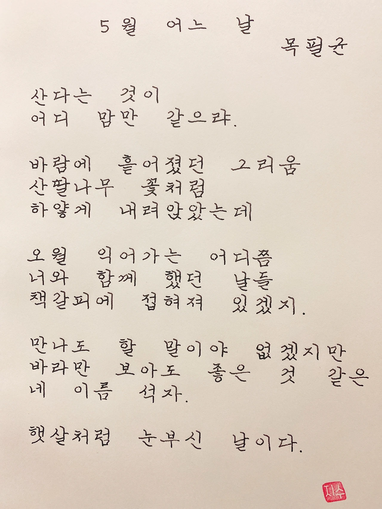 평범한 직장인. 사내 동호회를 통해 매일 한편 손으로 시 읽기를 시작한 이후로, 매일 시 한편을 필사 합니다. 필사한 시가 저작권에 문제가 된다면 말씀해주세요.