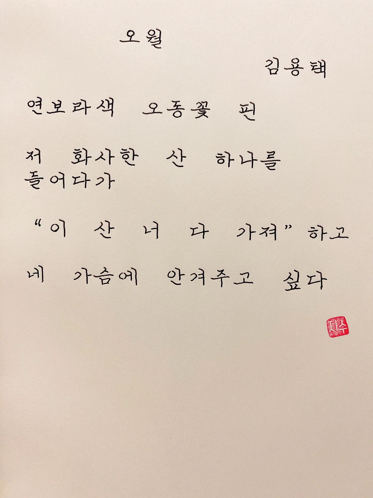 평범한 직장인. 사내 동호회를 통해 매일 한편 손으로 시 읽기를 시작한 이후로, 매일 시 한편을 필사 합니다. 필사한 시가 저작권에 문제가 된다면 말씀해주세요.
