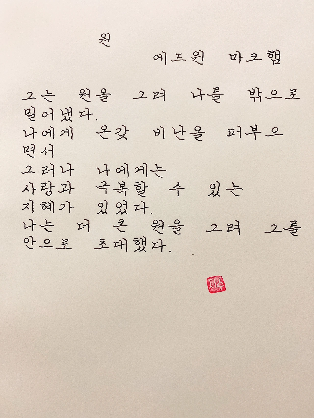 평범한 직장인. 사내 동호회를 통해 매일 한편 손으로 시 읽기를 시작한 이후로, 매일 시 한편을 필사 합니다. 필사한 시가 저작권에 문제가 된다면 말씀해주세요.