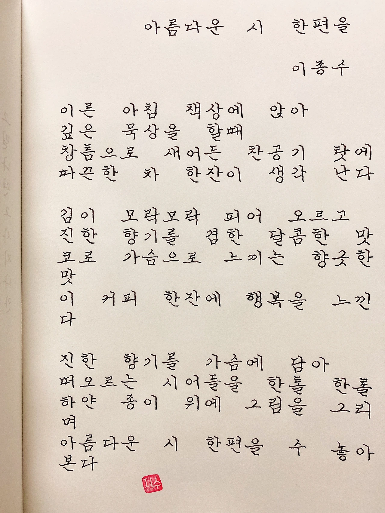 평범한 직장인. 사내 동호회를 통해 매일 한편 손으로 시 읽기를 시작한 이후로, 매일 시 한편을 필사 합니다. 필사한 시가 저작권에 문제가 된다면 말씀해주세요.