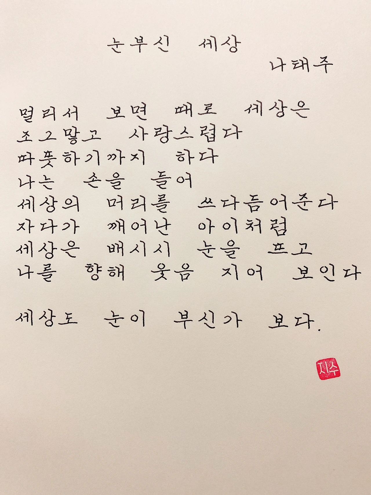 평범한 직장인. 사내 동호회를 통해 매일 한편 손으로 시 읽기를 시작한 이후로, 매일 시 한편을 필사 합니다. 필사한 시가 저작권에 문제가 된다면 말씀해주세요.