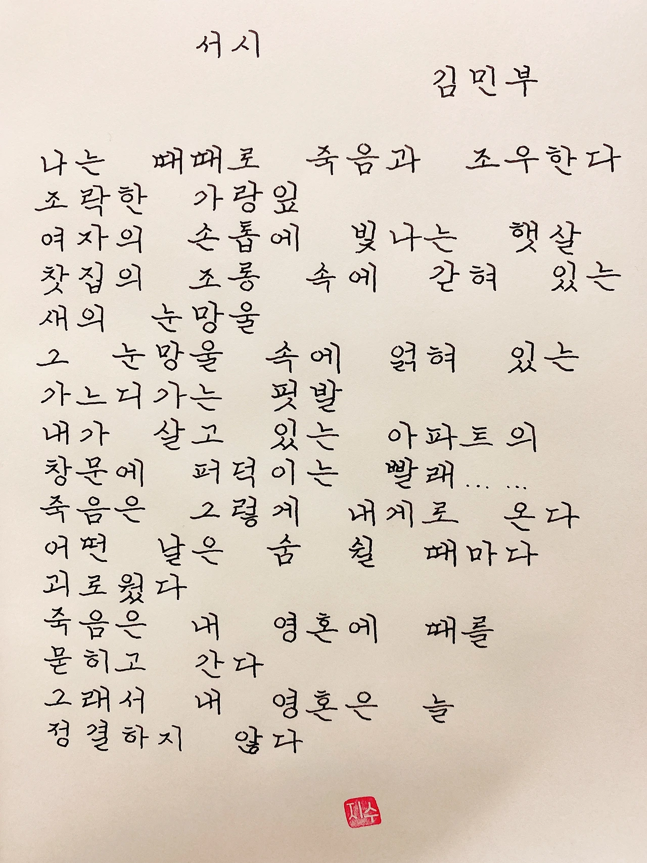 평범한 직장인. 사내 동호회를 통해 매일 한편 손으로 시 읽기를 시작한 이후로, 매일 시 한편을 필사 합니다. 필사한 시가 저작권에 문제가 된다면 말씀해주세요.