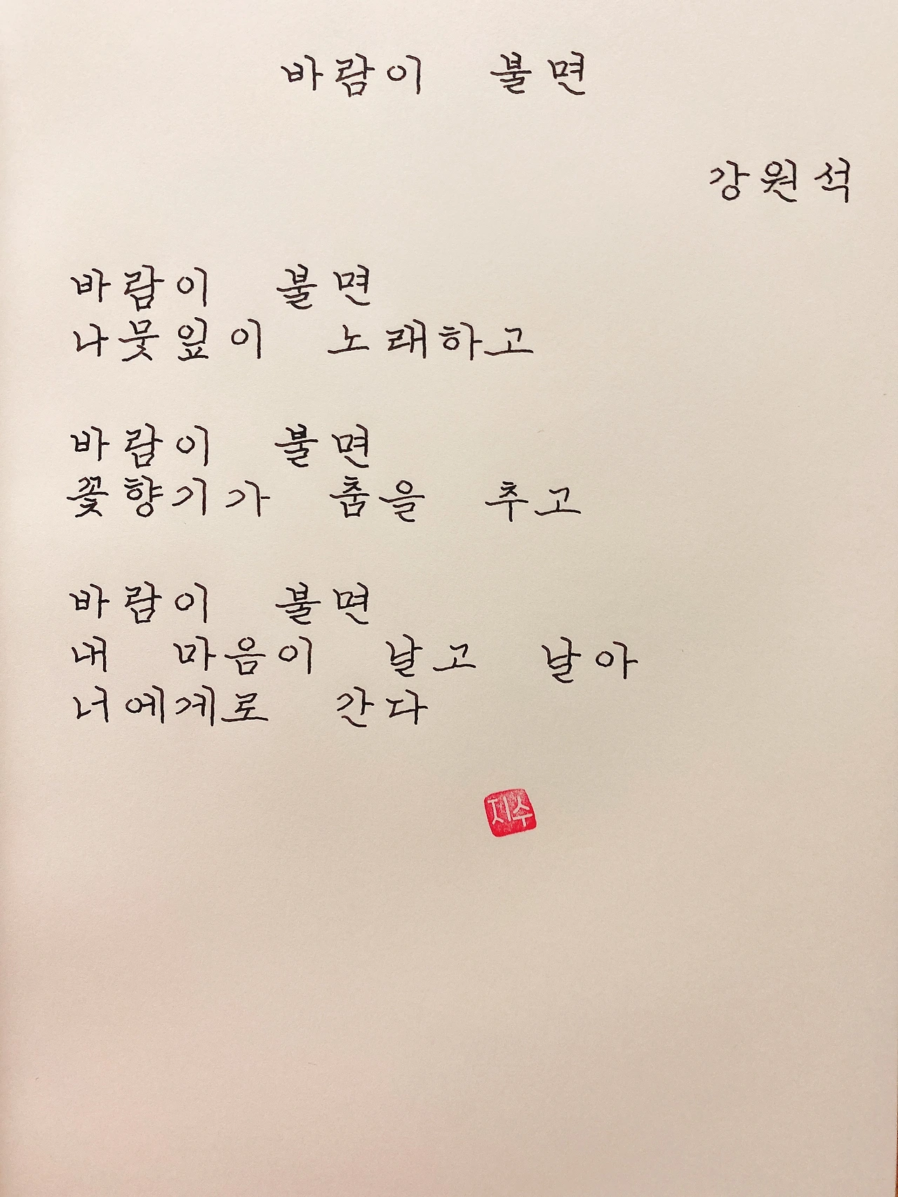 평범한 직장인. 사내 동호회를 통해 매일 한편 손으로 시 읽기를 시작한 이후로, 매일 시 한편을 필사 합니다. 필사한 시가 저작권에 문제가 된다면 말씀해주세요.