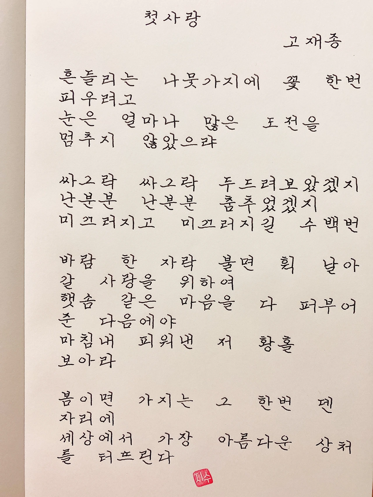 평범한 직장인. 사내 동호회를 통해 매일 한편 손으로 시 읽기를 시작한 이후로, 매일 시 한편을 필사 합니다. 필사한 시가 저작권에 문제가 된다면 말씀해주세요.