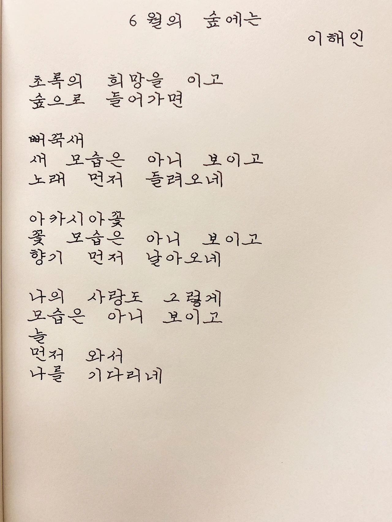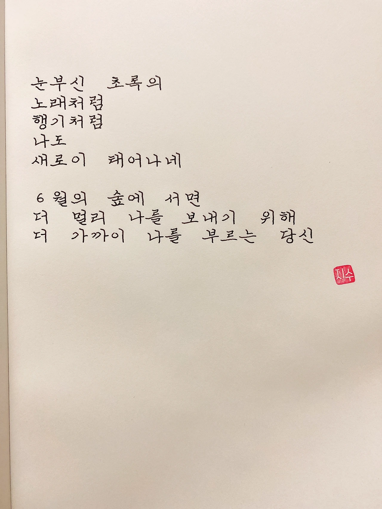 평범한 직장인. 사내 동호회를 통해 매일 한편 손으로 시 읽기를 시작한 이후로, 매일 시 한편을 필사 합니다. 필사한 시가 저작권에 문제가 된다면 말씀해주세요.