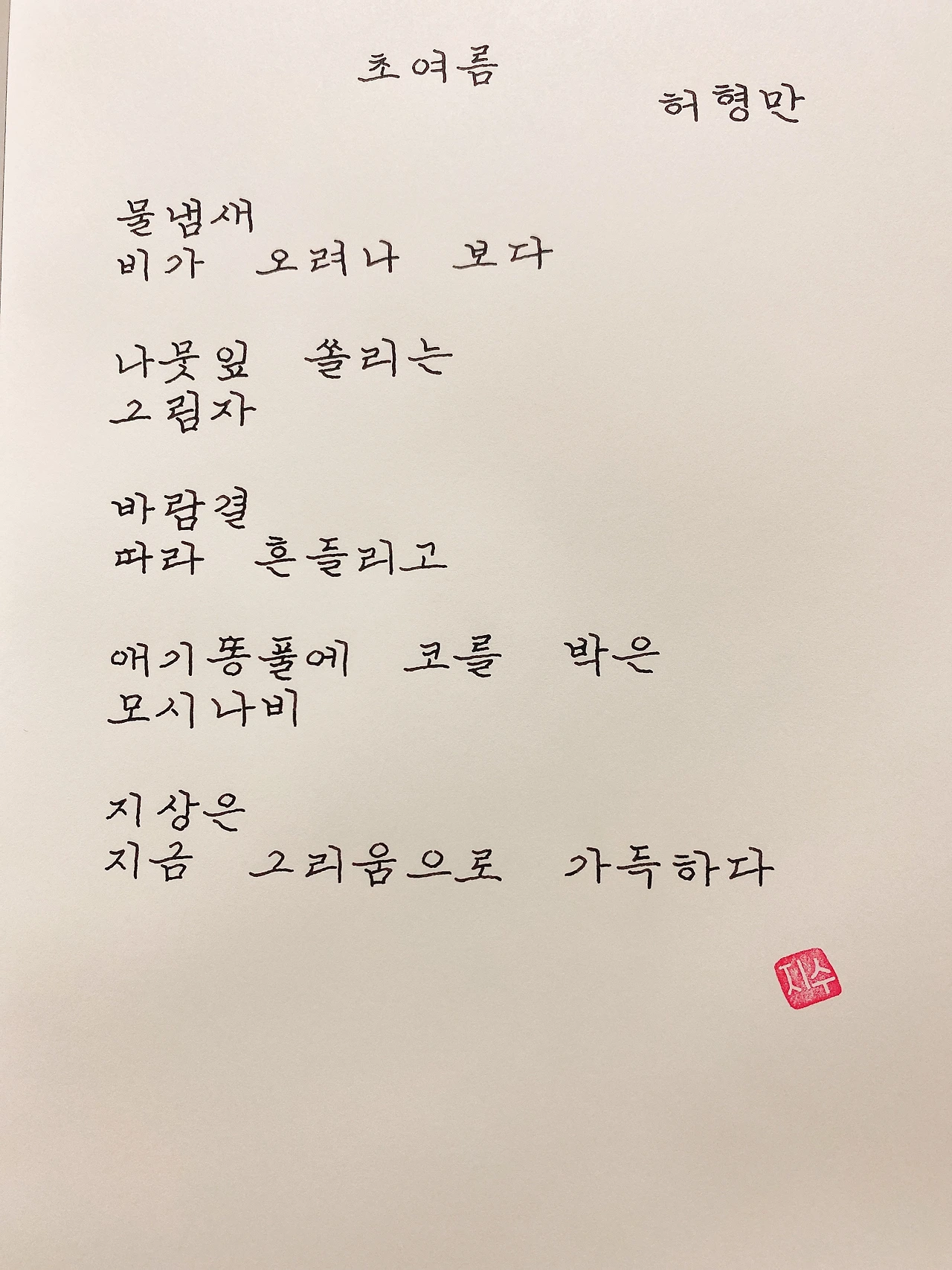 평범한 직장인. 사내 동호회를 통해 매일 한편 손으로 시 읽기를 시작한 이후로, 매일 시 한편을 필사 합니다. 필사한 시가 저작권에 문제가 된다면 말씀해주세요.