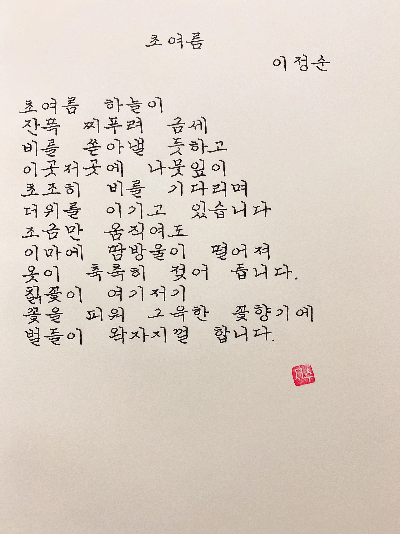 평범한 직장인. 사내 동호회를 통해 매일 한편 손으로 시 읽기를 시작한 이후로, 매일 시 한편을 필사 합니다. 필사한 시가 저작권에 문제가 된다면 말씀해주세요.